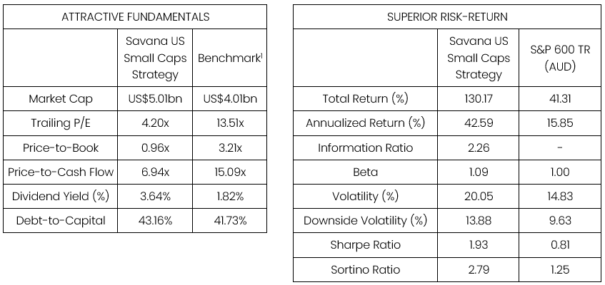 Source: Savana, S&P Capital IQ. Time-weighted average of the Savana US Small Caps paper-trade strategy from Jul-22 to Nov-24. 1 Fundamentals from the iShares Core S&P Small-Cap ETF (NYSE:IJR) is used as a proxy for the S&P 600 TR Index.