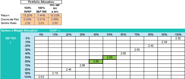 So how does SVNP compare under this revised condition? Adjusting to consider downside risk only, SVNP exhibits a higher Sortino Ratio than the S&P 500 over the three-month period (2.32 versus 2.03), suggesting a superior risk-return profile. Still, it is shown that the Sortino Ratio is maximised by allocating across both securities, with a ~40-50% allocation to SVNP (and a ~50-60% allocation to the S&P 500) yielding an optimised Sortino of 2.65.