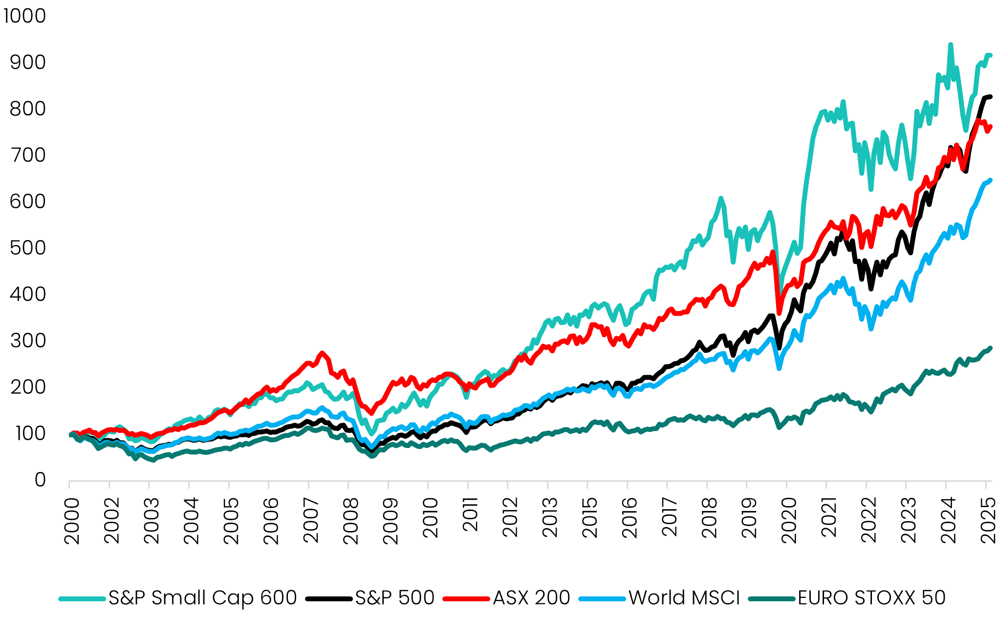 While recent market narratives have focused on large-cap performance, a longer-term perspective demonstrates that US Small Caps have in fact generated the most compelling long-term returns across market cycles. Over the last 25 years, the S&P Small Cap 600 has returned 9.27% per annum, exceeding the S&P 500 (8.83% p.a.), the ASX 200 (8.48% p.a.) and other major indices.