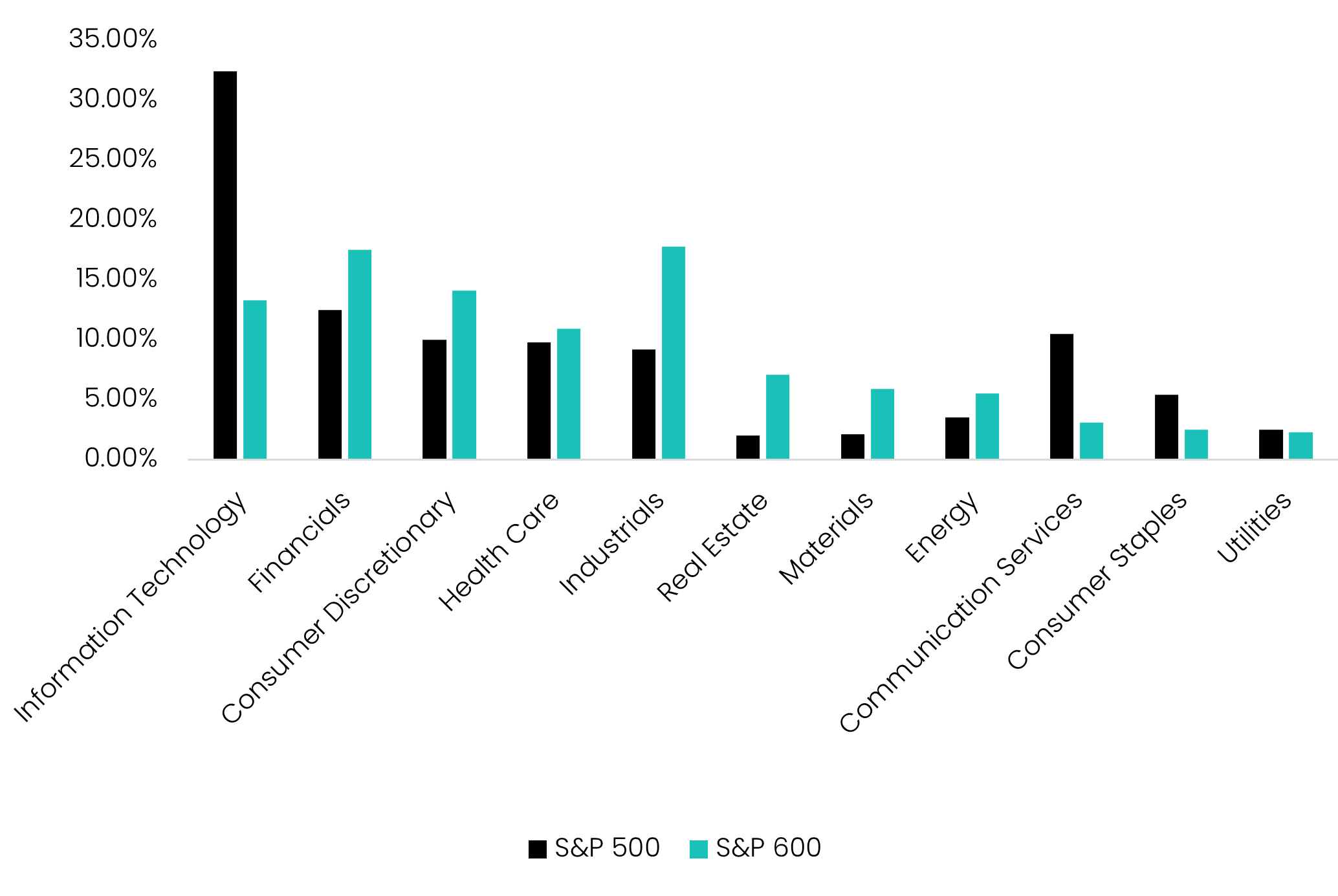 By comparison, the S&P Small Cap 600 exhibits far broader stock-level participation, with the top 10 companies representing just 5.8%, alongside a more balanced distribution of sector exposures.
